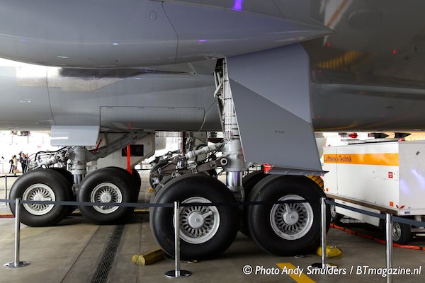 31-05-2012 TRAVEL; LUFTHANSA INTRODUCTION BOEING 747-8; FRANKFURT AIRPORT; FRANKFURT; GERMANY In Lufthansa’s A380 hanger nummer 7 stonden de nieuwe Boeing 747-800 de D-ABYA de Brandenburg en de Airbus 380-800 de D-AIMD Tokio samen in hangar nummer 7. Het is de eerste keer dat 2 van de nieuwste generatie vliegtuigen samen in een hangar staan. Lufthansa had de pers uitgenodigd om een kijkje te nemen naar de nieuwe producten aanboord en een inzicht te geven in de toekomst plannen van Lufthansa. Op de foto het landingsgestel van de Boeing 747-8. Foto Andy Smulders / Persfoto.com