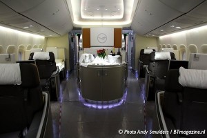 31-05-2012 TRAVEL; LUFTHANSA INTRODUCTION BOEING 747-8; FRANKFURT AIRPORT; FRANKFURT; GERMANY In Lufthansa’s A380 hanger nummer 7 stonden de nieuwe Boeing 747-800 de D-ABYA de Brandenburg en de Airbus 380-800 de D-AIMD Tokio samen in hangar nummer 7. Het is de eerste keer dat 2 van de nieuwste generatie vliegtuigen samen in een hangar staan. Lufthansa had de pers uitgenodigd om een kijkje te nemen naar de nieuwe producten aanboord en een inzicht te geven in de toekomst plannen van Lufthansa. Op de foto de nieuwe First Class. Foto Andy Smulders / Persfoto.com