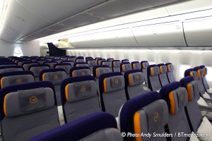 31-05-2012 TRAVEL; LUFTHANSA INTRODUCTION BOEING 747-8; FRANKFURT AIRPORT; FRANKFURT; GERMANY In Lufthansa’s A380 hanger nummer 7 stonden de nieuwe Boeing 747-800 de D-ABYA de Brandenburg en de Airbus 380-800 de D-AIMD Tokio samen in hangar nummer 7. Het is de eerste keer dat 2 van de nieuwste generatie vliegtuigen samen in een hangar staan. Lufthansa had de pers uitgenodigd om een kijkje te nemen naar de nieuwe producten aanboord en een inzicht te geven in de toekomst plannen van Lufthansa. Op de foto de Economy Class. Foto Andy Smulders / Persfoto.com